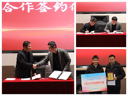 在热烈的氛围中,校企双方代表正式签署了合作协议。紧接着,慧川电梯副总经理邓凯向学校移交了捐赠设备的详细清单及纪念牌,物联科技学院胡风雨副主任代表学校接受了这份珍贵的礼物。